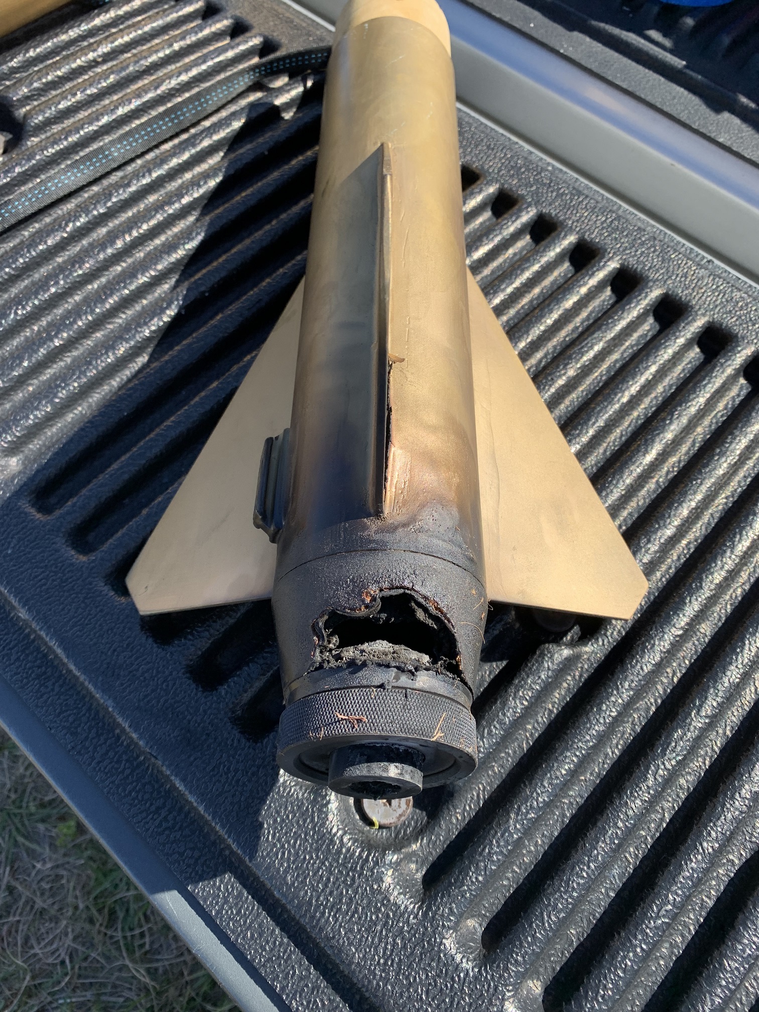Burn through occurred at less than 1,000 feet. The rocket continued to rise in an odd corkscrew fashion to about 60% of expected altitude with reduced power because of the second 'nozzle'. Apogee and the drogue ejection charge fired while still under limited power.