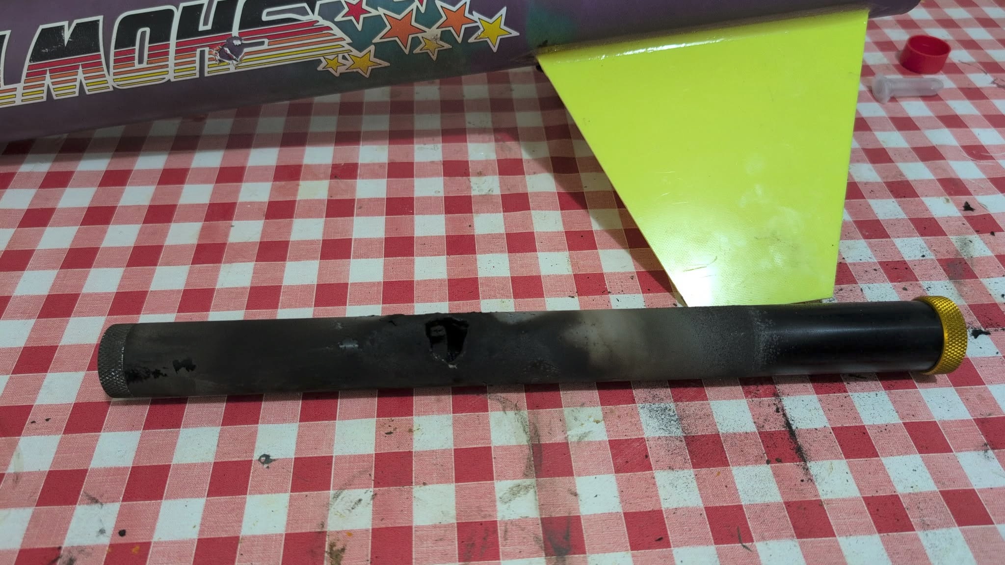 Flight in a Rocketman Showtime (2.6" fibreglass rocket with 38mm mount, approx 2kg on the pad), with an aeropack adapter. Burned for a fraction of a second before failure, launching to about 200 feet and then cartwheeling about with flames coming out of both ends, before the main parachute deployed. The flame was hot enough to discolour the fibreglass fuselage, leaving it too hot to touch when I reached it, and it looks like it has burned through the fibreglass motor tube where the burn through happened as well. When I got home I filmed myself dismantling the motor while checking against the assembly instructions to see if I could find any obvious mistakes, but everything appeared to be where I expected it.