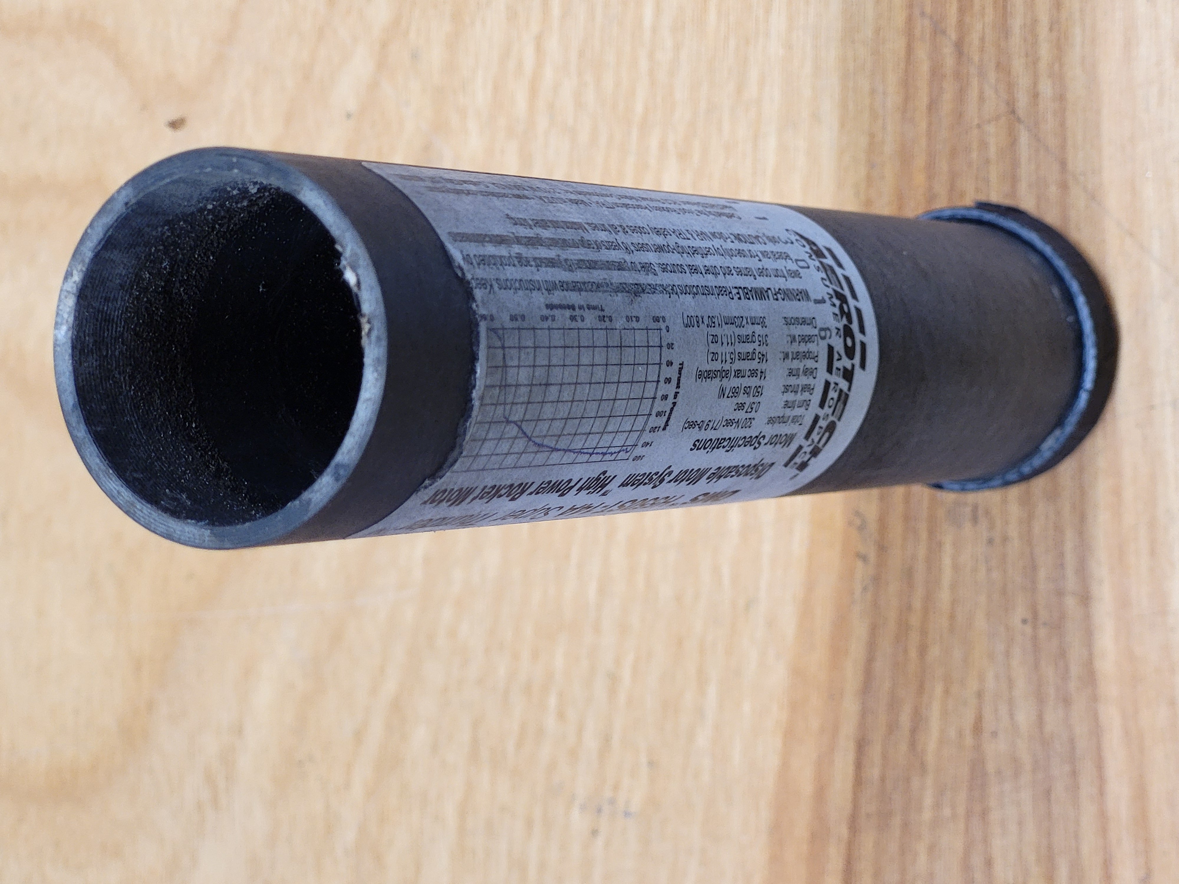 The forward end of the motor separated immediately upon ignition. The DMS casing showed no other damage, it appears to be a bonding failure of the forward closure (possibly due to thermal stress as the outside air temperature at the time of the launch was about 15F). The rocket motor was forced down out of the motor mount tube, shearing the cardboard joint that was gluing the aeropack retainer on. The propellant grains were ejected out the forward end of the motor and immediately extinguished. Minimal damage to rocket. Only damage was the aeropack retainer being forced off the end of the motor tube.