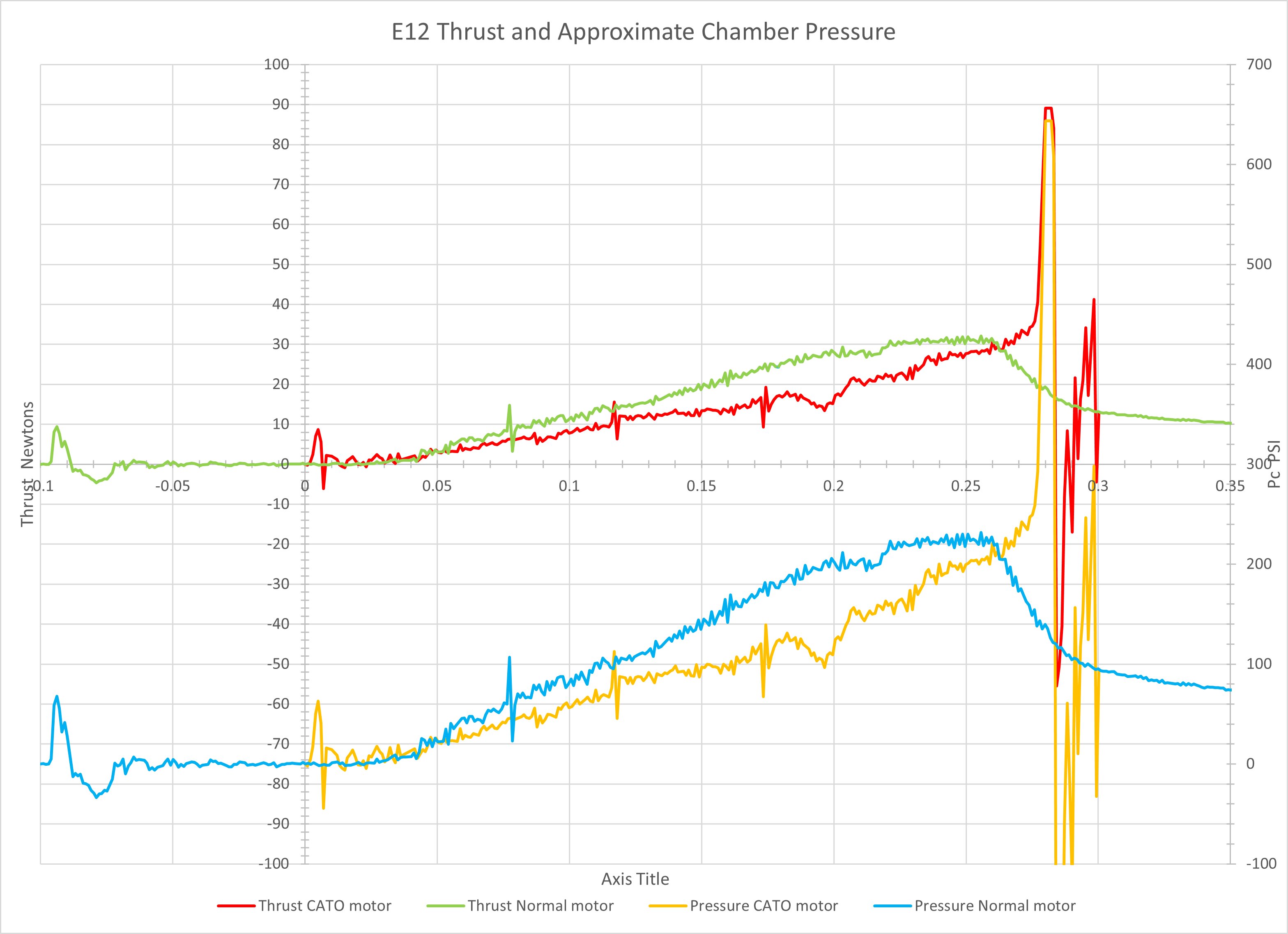 The Boosted Bertha was carrying my 1KHz flight computer recording; acceleration, thrust, and approximate chamber pressure. The motor burned 275ms before failure. It also exhibited a very short ignition delay of <50ms. A normal E12 has an ignition delay of 120-180ms. I'm including a graph of the CATO data and a comparison to a normal E12 ignition to peak thrust.