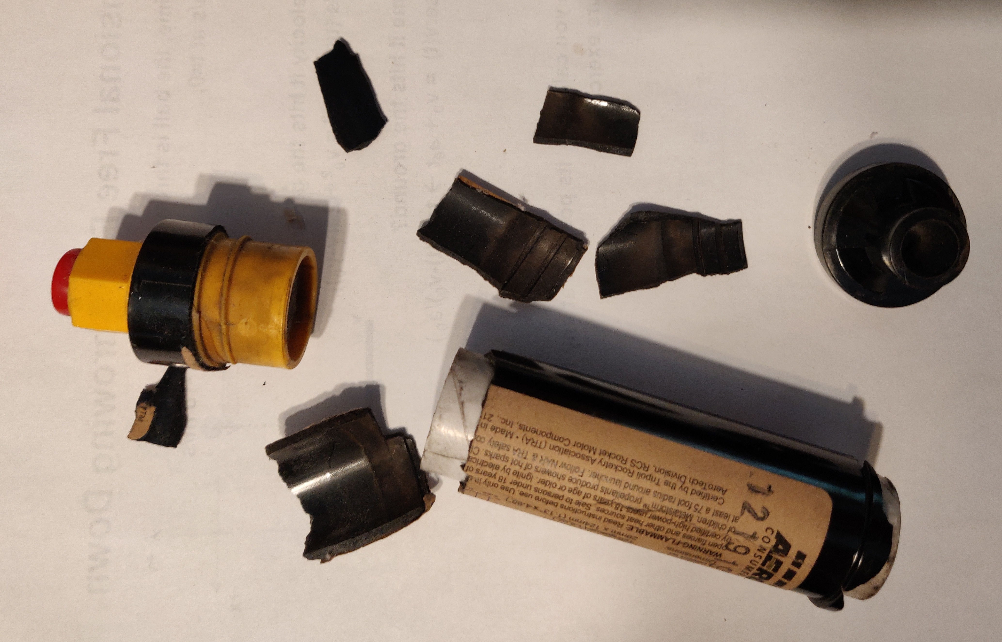 The whole molded casing just popped. There are 6 or so large pieces and many other small ones, most of which fell onto the ground at the launch site and were lost. The motor was in an aeropack 29-38 adapter, and the top of the casing looks like it was cleanly cut off right at the top of the adapter. The pressure drop must have been sudden enough that all the grains were snuffed out. Fortunately there was no damage to the rocket or pad.