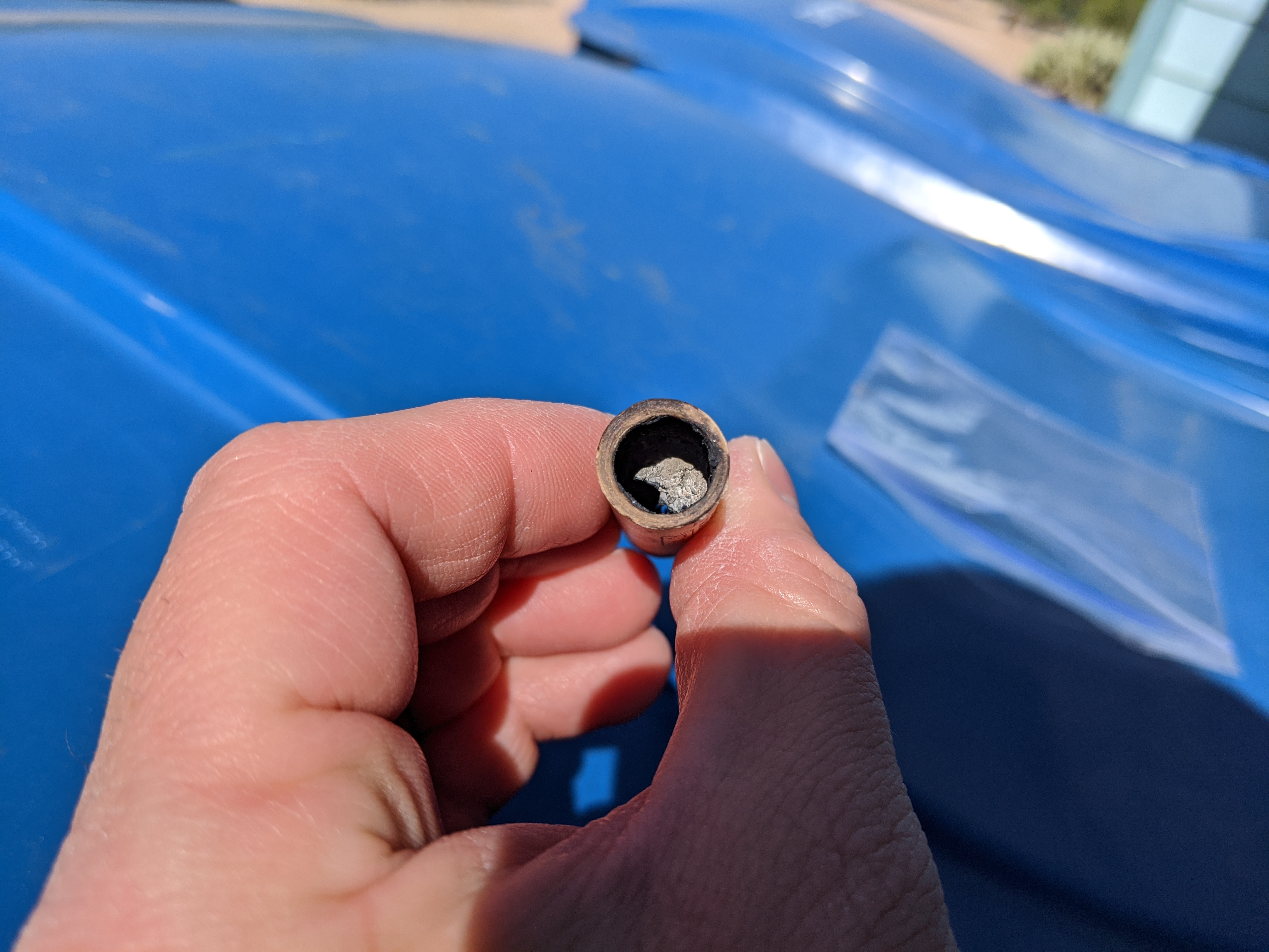 Weak ejection charge. Over half the clay ejection retainer cap remained in the motor case.