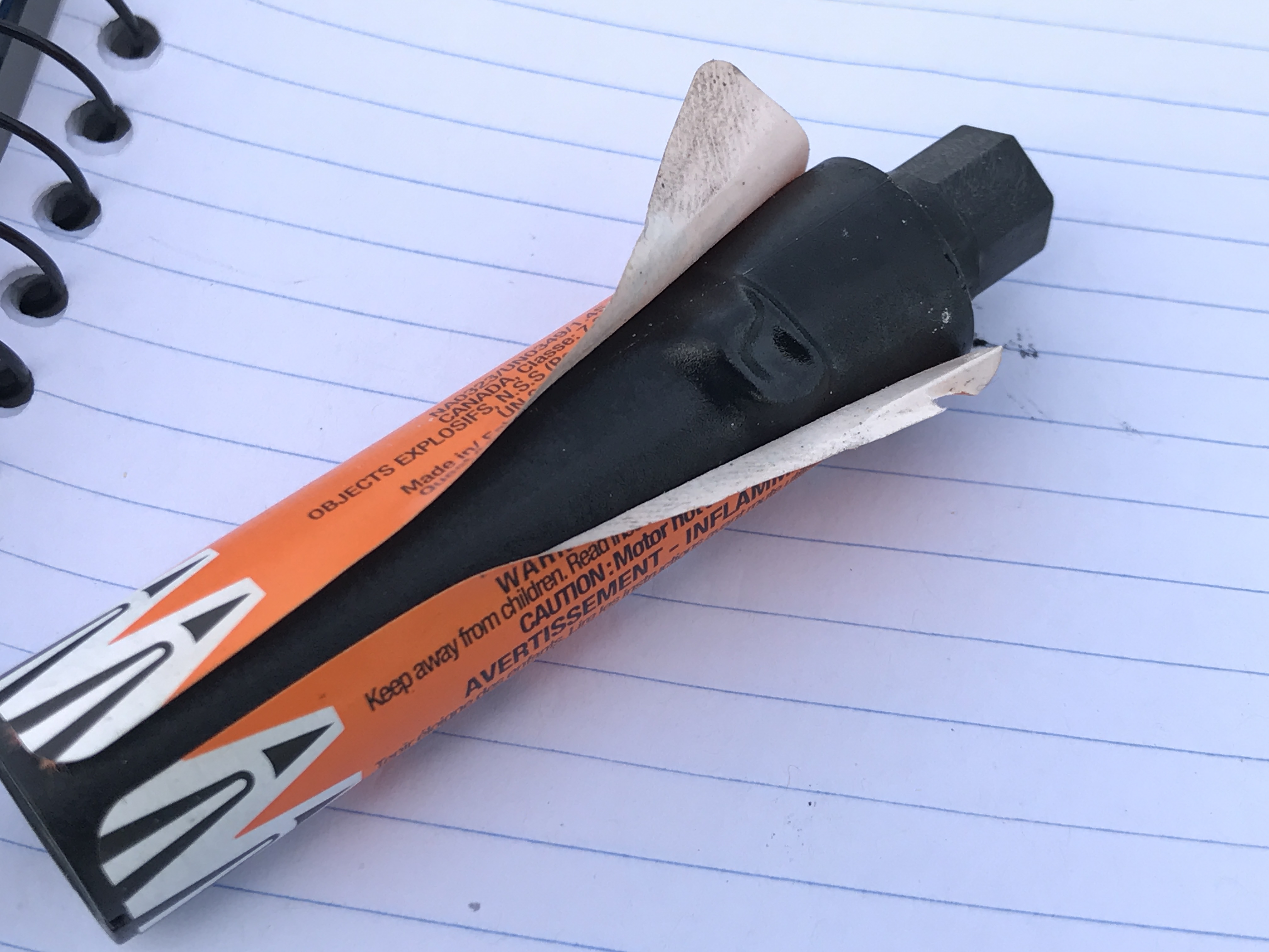 Motor operated normally but casing was bubbled about 3/8 of an inch from the top of the main case (perhaps at the base of the propellant).