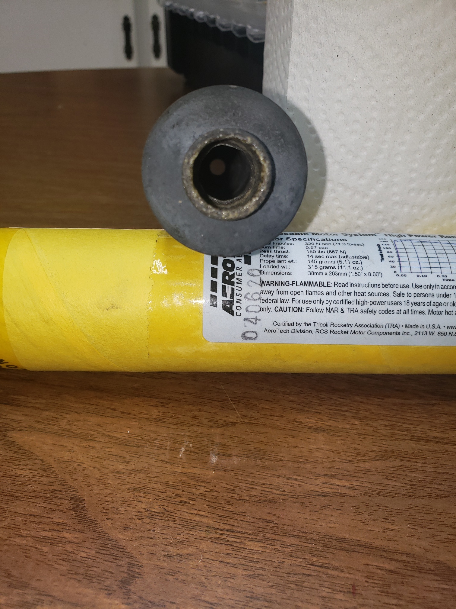 Reviewing video, cleared 6' launch rod 2 feet before nose cone blew off. Motor total burn time less than 1 second. A lot of fire coming from top of rocket once the nose cone came off.