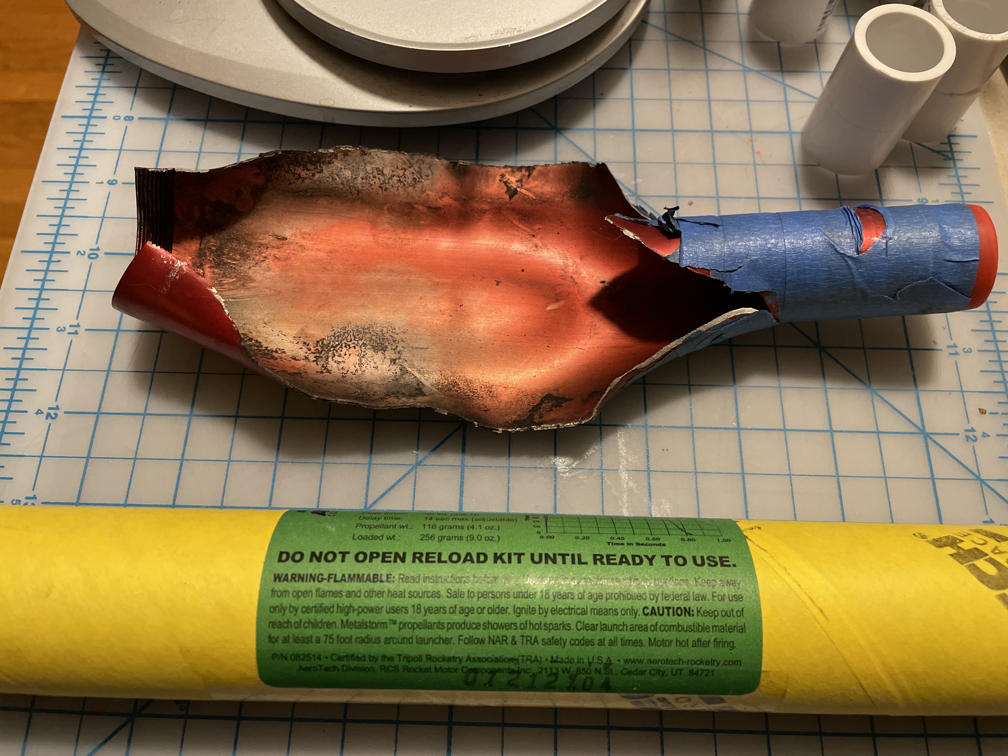 Overpressurized shortly after takeoff. Delay grain remained intact, ejection never ignited, case split almost entire length.