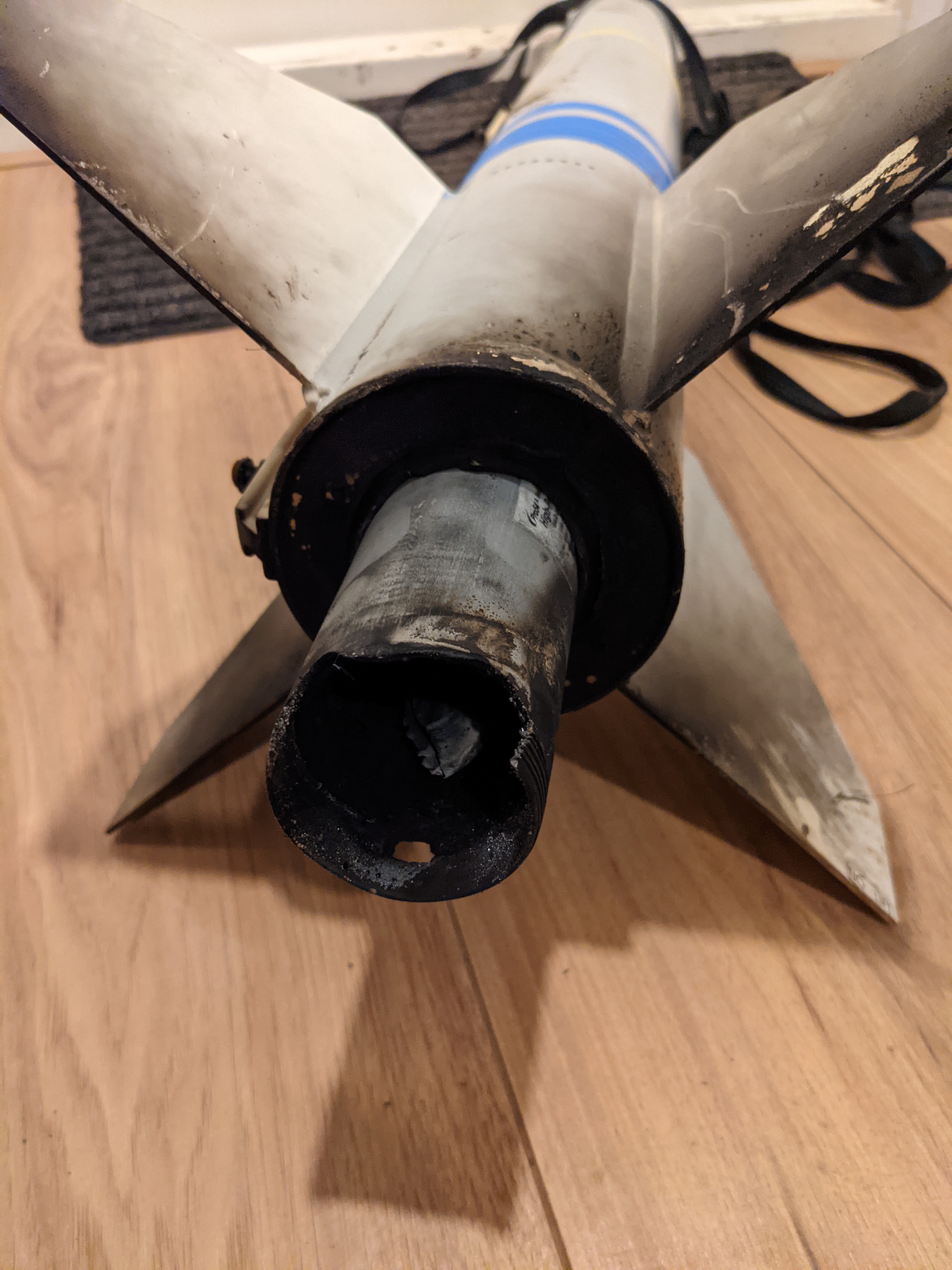 The motor casing seemed to fail after about 3seconds in to the flight. A bright flash (see picture attached). It blew off part of the casing and entire assembly of rear closure, retainer, nozzle and retainer cap. This landed quite close to us. Flight was about 220m vs expected 742m. It was dual deployment flight so charges went off and rocket landed safely.