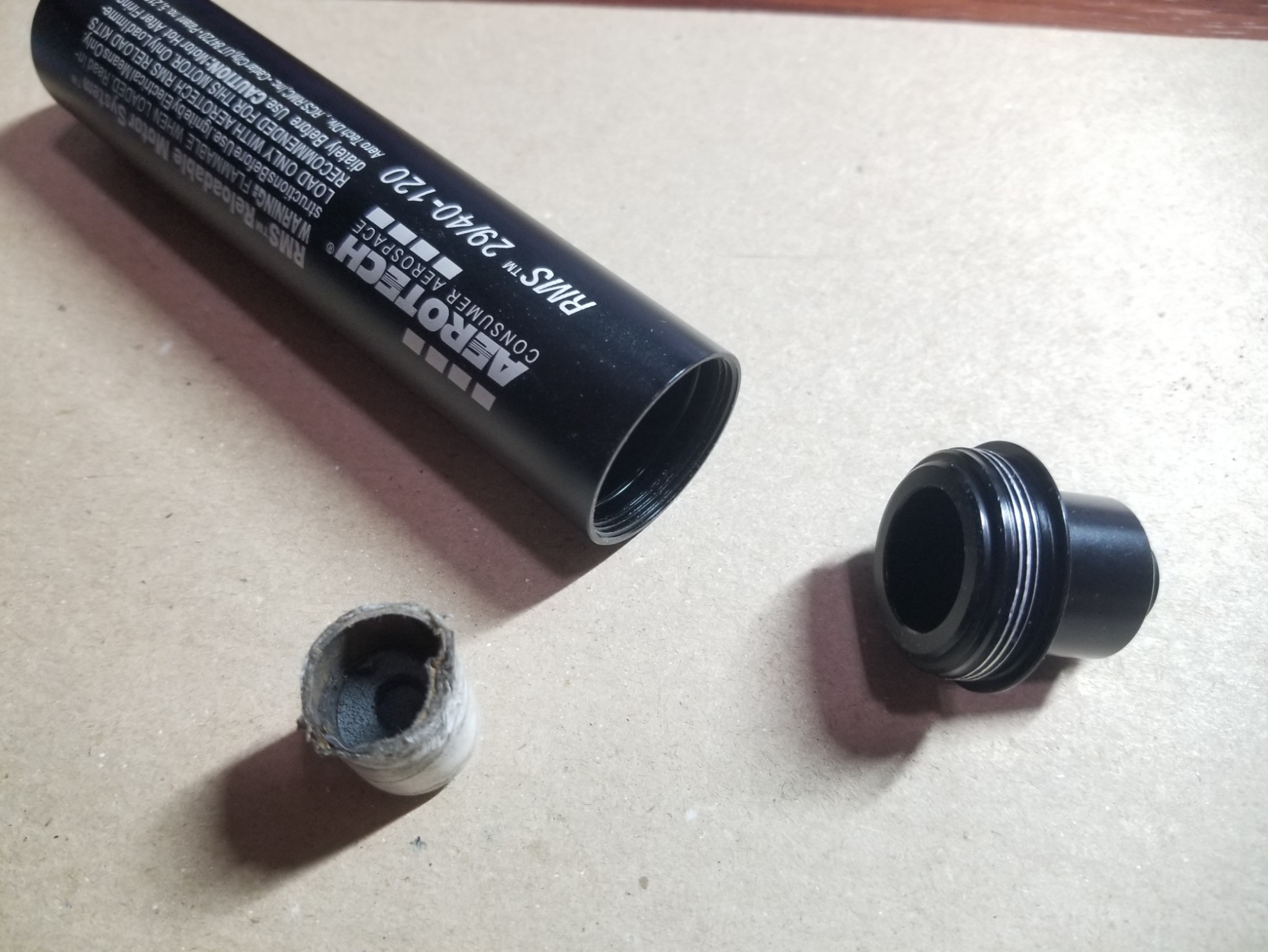 The front closure blew off immediately after ignition and launch, ejecting the entire reload across the launch site. I was able to find the front closure and delay grain. The threads on both the front closure and the front part of the case are stripped from the force of the failure.