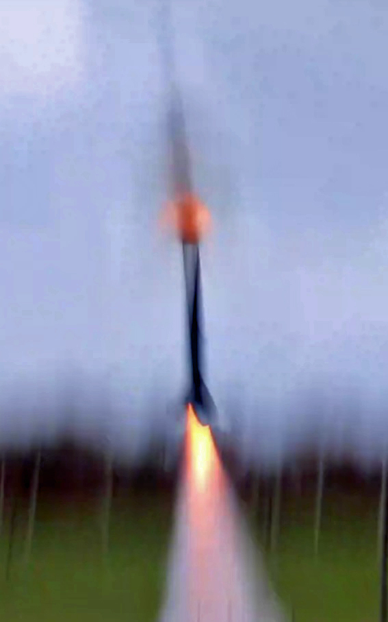 Shortly after ignition, the nozzle must have blown out and the "core" seems to have burned rapidly, igniting the ejection charge while still burning the propulsion segment, then dislodging from the engine casing and proceeding through the rocket body and exiting the rocket in a traveling fireball. Engine casing (totally empty) was still secure in the motor tube. Damage to the rocket is surprisingly minimal - mostly just a cracked fin due to the landing without a 'chute (which was detached with the nose cone on ejection). Video frame by frame review helped determine these events.