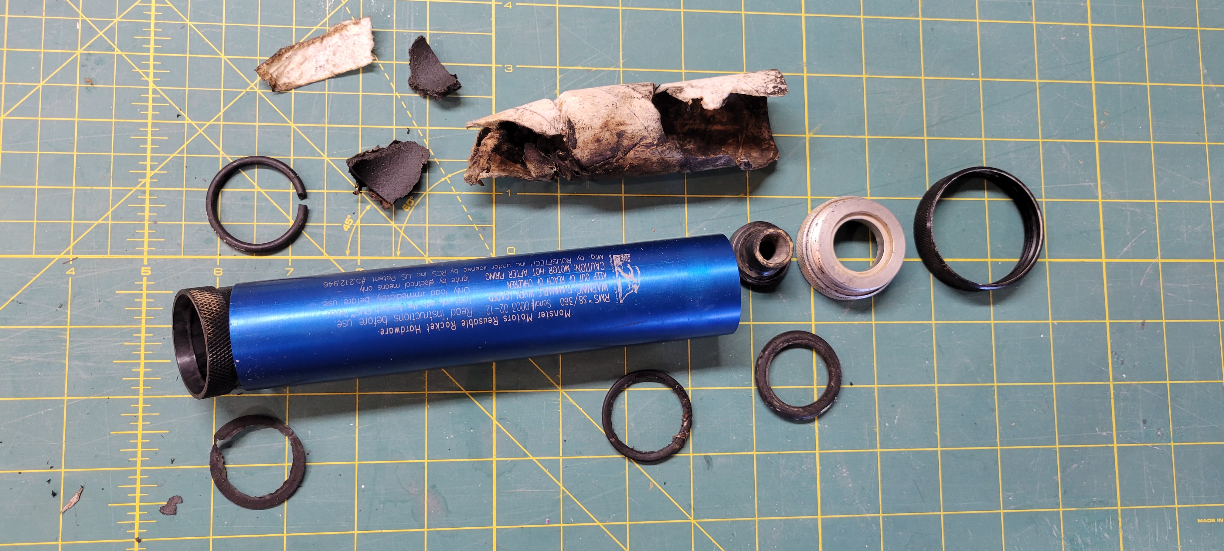 About 0.5 s into burn, floating forward closure spit through the foward ring and was not recovered. Forward closure o-ring was recovered. It was split. Back pressure from forward closure failure then blew motor case back out through the retaining ring.
