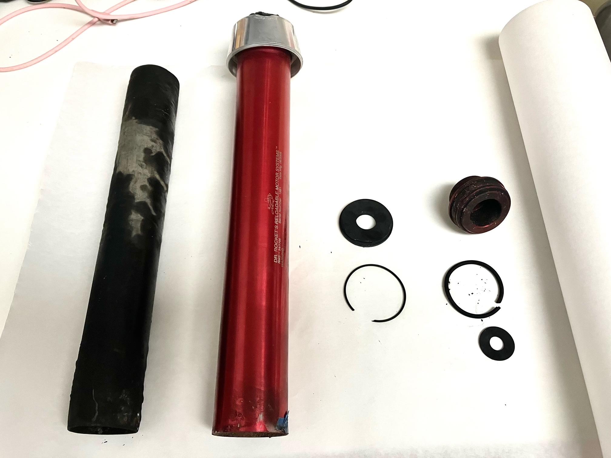 Casing ejected through the motor retainer and out of the motor tube. O-rings for the forward seal disk and forward closure did not function as designed.