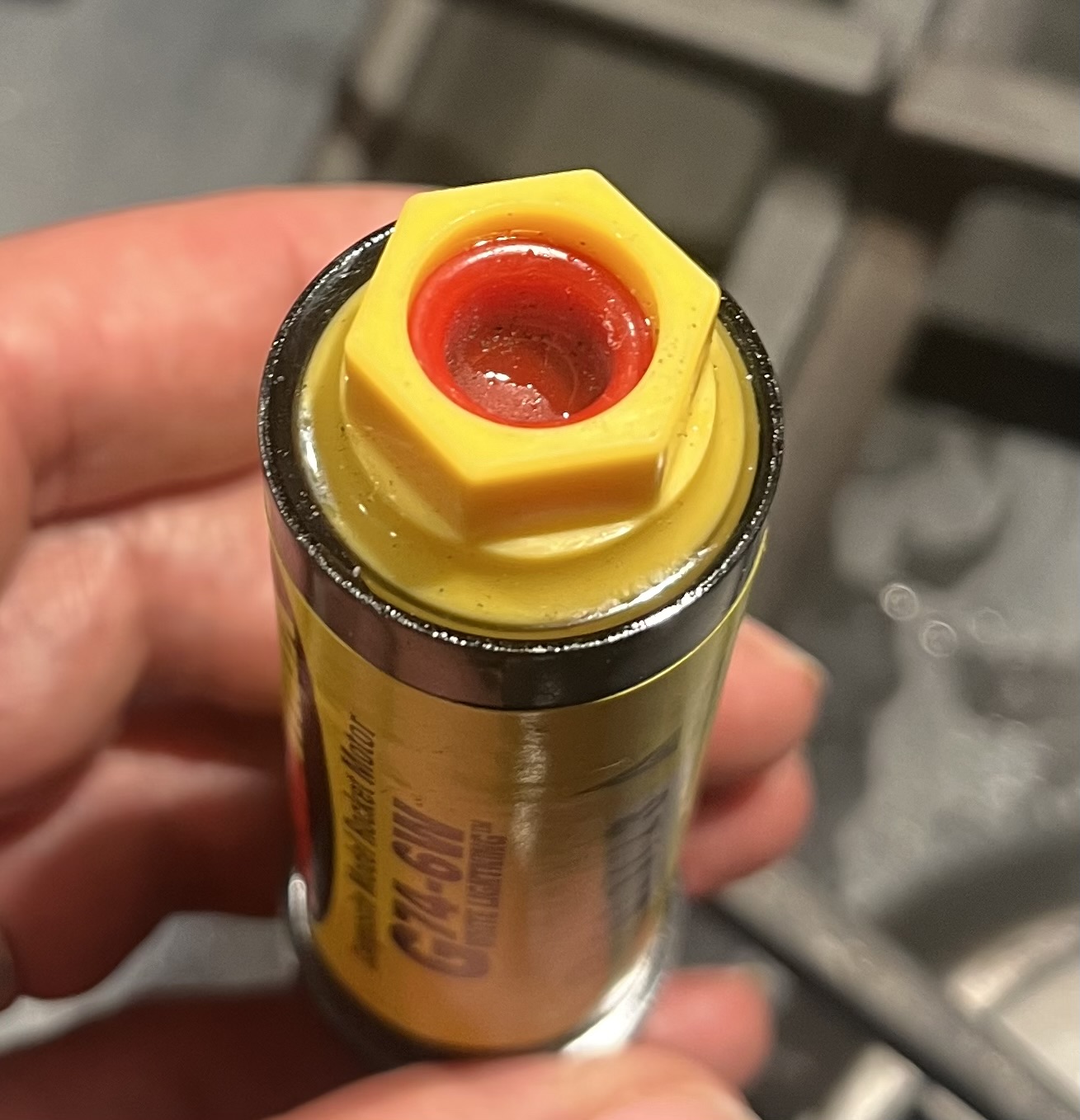 Motor appeared to have a normal propellant burn, but ejection failed. Red cap is still firmly secure in the yellow forward retainer. I'm wondering if the wet appearance of the red cap is due to adhesive that might have unintentionally dripped onto it during assembly?