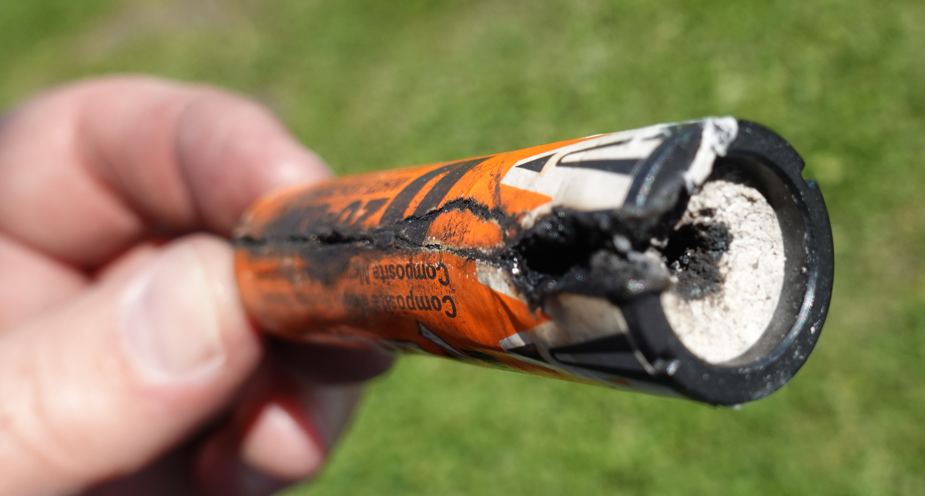 The motor burned through all along one side of the case. See picture. Fortunately, the rocket was only slightly damaged.