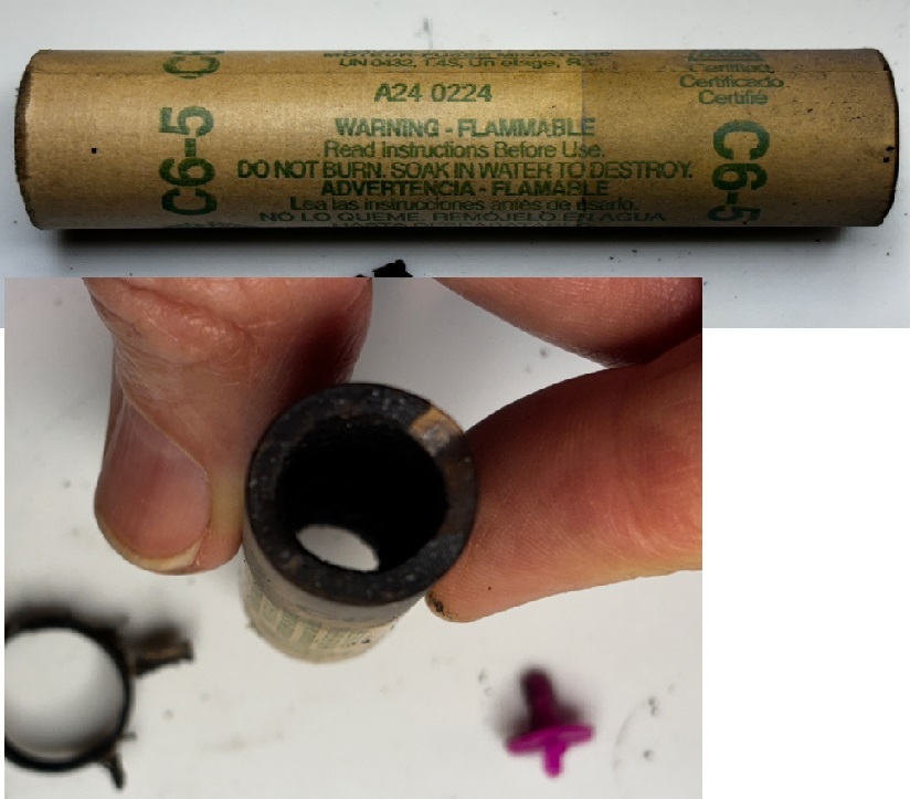 Motor made a loud "POW" almost immediately upon ignition. The burning fuel grain launched up through the body, burning the chute, forces damaged the body tube. The motor mount was damaged, motor case retained within the mount. Second flight of a home-made rocket, Estes motor mount. Mount adapter rings remained intact.
