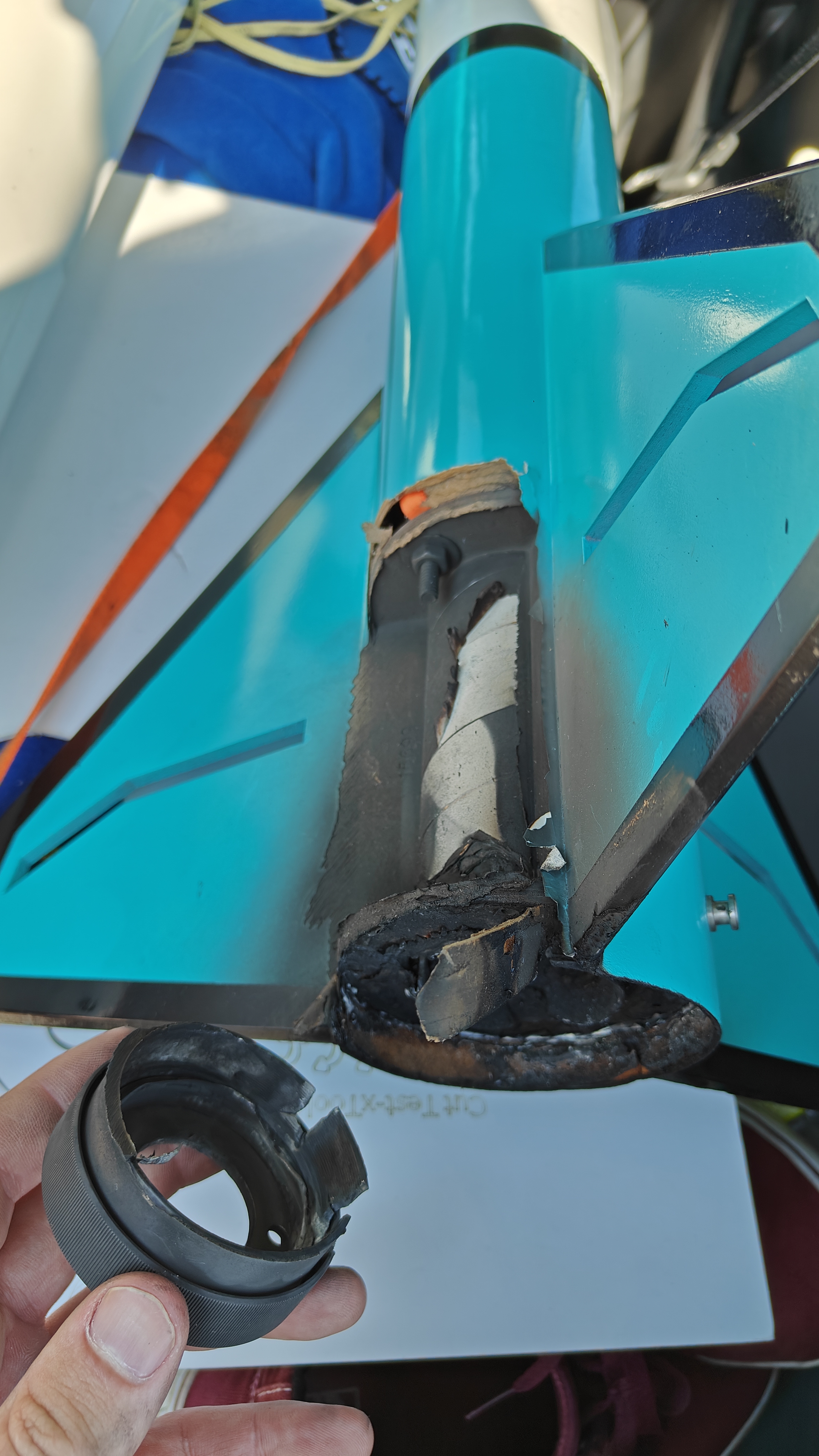 The motor lifted off and burned fine for about 4 seconds, which is about half the full burn. The aft closure and motor retainer both were blown off the back of the rocket.