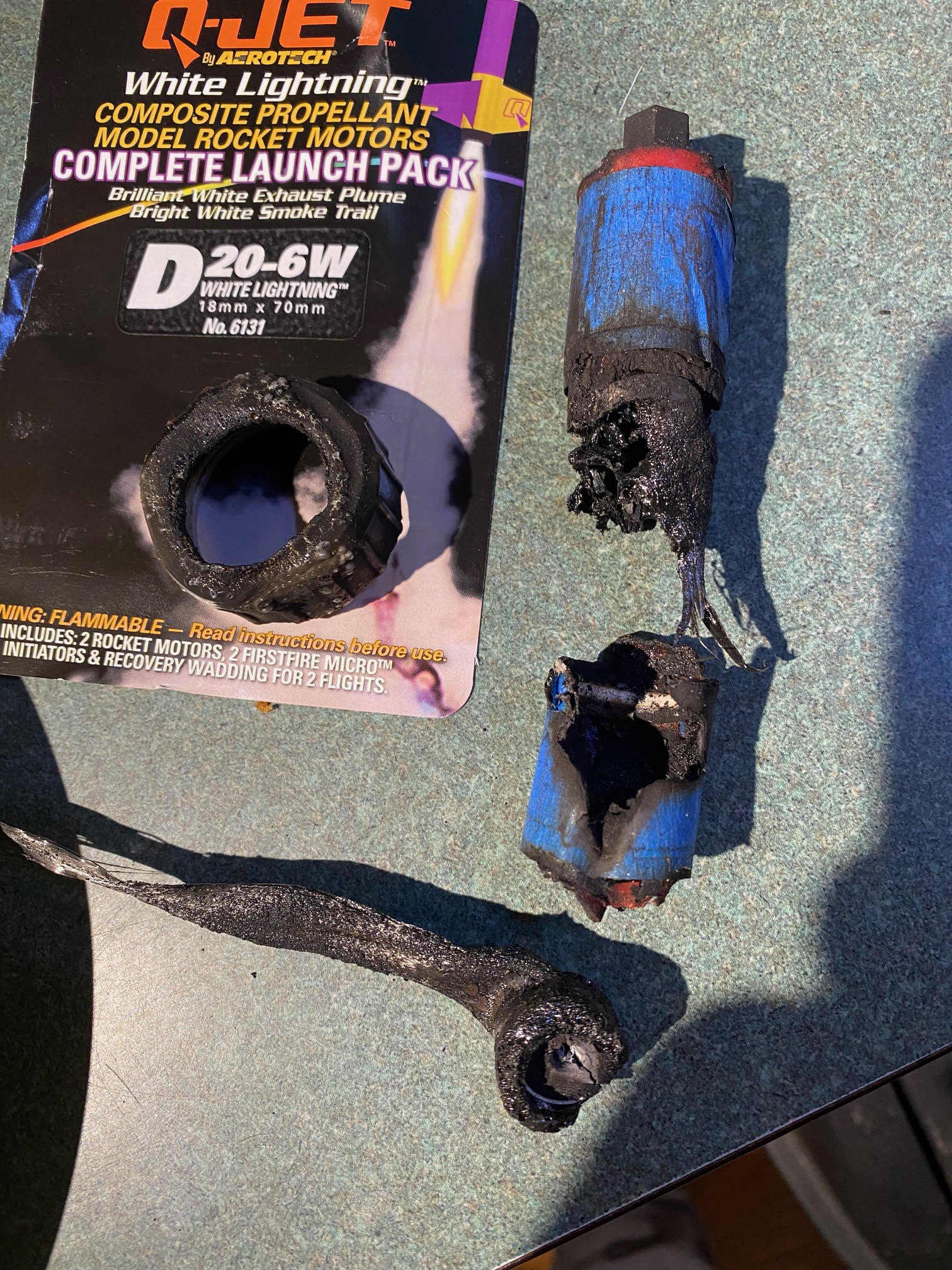 The failure happened at liftoff. The igniter lit, the motor chuffed and then caught fire, causing fire to the rocket and melting the motor retainer. This was an 18mm motor that flew in a rocket w/ adapter for 24mm.