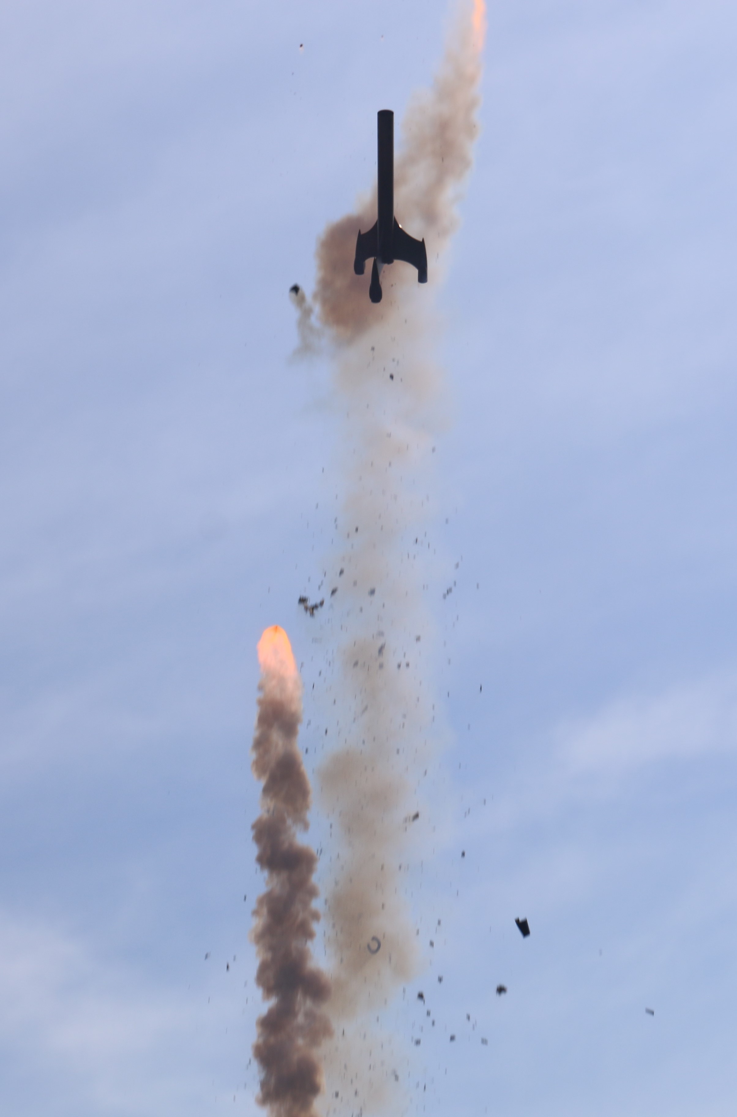 The motor malfunctioned about 6 feet after clearing the rod. It appears to have blown out the ejection end, and the propellant blew out the top of the rocket, taking the mmt with it clear of the body tube. The engine casing also blew out of the MMT, and broke the tail cone as well. The engine nozzle is still intact and shows little burning.